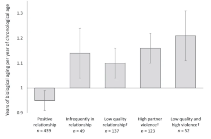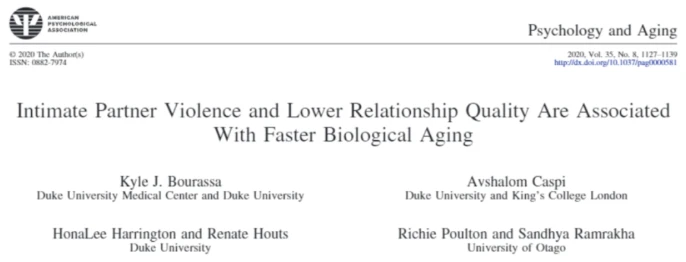The study found that as time went on, increasing emotional and life stress correlated with a decline in the health of one's partner. Psychological violence was more common across all age groups. At age 32, the incidence of physical and psychological violence by either partner was as high as 71.7%, decreasing by age 45. Those who experienced partner violence actually aged faster, especially those who suffered physical violence. Furthermore, there was an independent relationship between relationship quality and partner violence and biological aging.